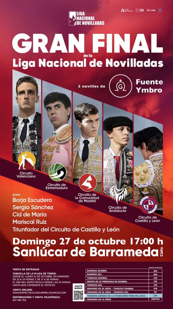 El triunfador de cada uno de los Circuitos de novilladas celebrados este año luchará por convertirse en el triunfador absoluto de la temporada. Así, harán el paseíllo Borja Escudero, triunfador del Circuito Valenciano; Sergio Sánchez, triunfador del Circuito de Extremadura; Mariscal Ruiz, triunfador del Circuito de Andalucía; Cid de María, finalista del Circuito de Madrid, ocupará el puesto de Jarocho, que ya ha tomado la alternativa; solo queda por conocer al triunfador del Circuito de Castilla y León, cuya final se celebra este domingo en Alba de Tormes.La Junta de Andalucía fue pionera en su apuesta por los Circuitos de novilladas con picadores. Así, la Liga Nacional de Novilladas comenzó en 2020, en plena pandemia, con el primer Circuito de Novilladas de Andalucía. En su objetivo de fomentar y promover la tauromaquia, la Junta de Andalucía ha querido apostar por este proyecto de oportunidades y ofrecerle el broche de oro de la gran final.