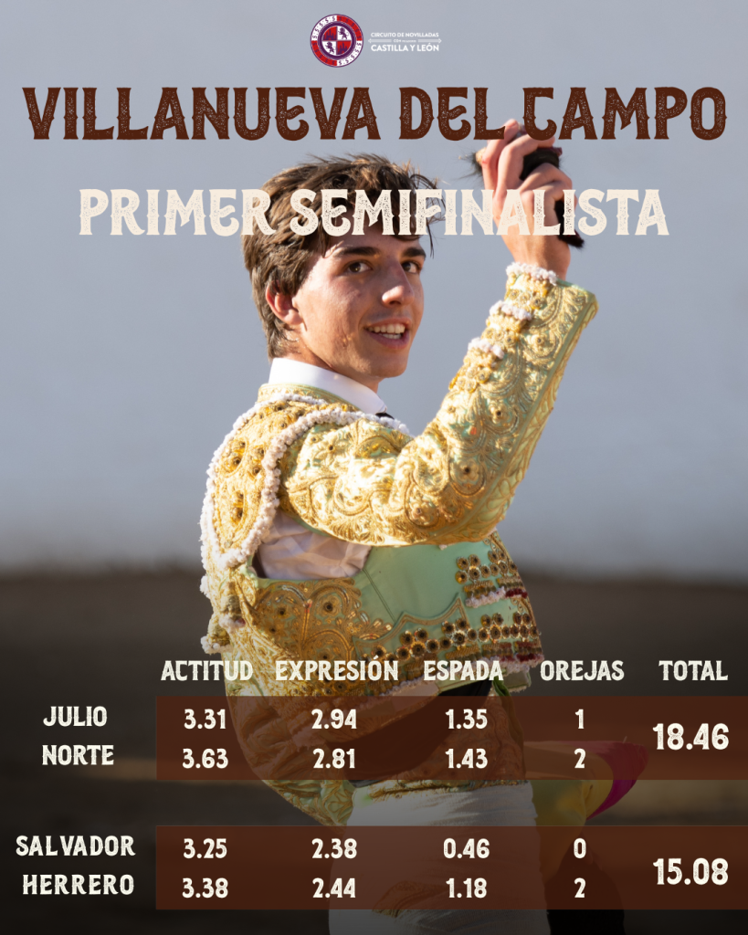 Tras la deliberación del jurado, el primer semifinalista del Circuito de Castilla y León 2025 es Julio Norte , quien con 18,46 puntos se alza como triunfador del festejo . Por su parte, Salvador Herrero sumó un total de 15,08 puntos .