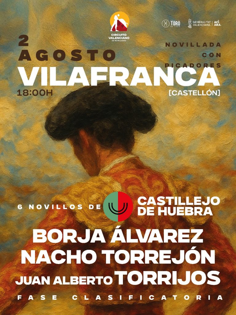 - Vilafranca (Castellón) (02/08): 6 novillos de Castillejo de Huebra para Borja Álvarez, Nacho Torrejón y Juan Alberto Torrijos. A las 18:00 horas